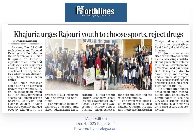 RAJOURI, Dec 3: Noted civil society leader, advocate, and honorary patron of the National Development Foundation, Rajiv Kumar Khajuria, engaged with children and adolescents in the Doongi block of Rajouri and strongly urged them to embrace sports and healthy activities while firmly saying no to drugs. He spoke after the National Development Foundation (NDF), in partnership with UNICEF India, distributed sports equipment to children and adolescents in the Sawani, Chatyar, and Doongi areas of Rajouri district. Khajuria formally handed over the sports kits in the presence of NDF team members Amit Sharma and Sahil Singh. Besides the children’s and adolescents’ groups in the three villages, sports materials were also provided to Government Higher Secondary School Doongi, Government High School Sawani, and Government Middle School Chatyar for the benefit of the schoolchildren and the wider village community.