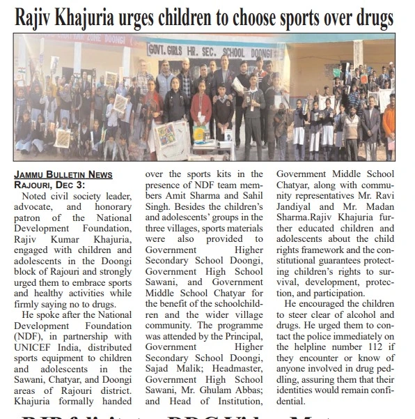 RAJOURI, Dec 3: Noted civil society leader, advocate, and honorary patron of the National Development Foundation, Rajiv Kumar Khajuria, engaged with children and adolescents in the Doongi block of Rajouri and strongly urged them to embrace sports and healthy activities while firmly saying no to drugs. He spoke after the National Development Foundation (NDF), in partnership with UNICEF India, distributed sports equipment to children and adolescents in the Sawani, Chatyar, and Doongi areas of Rajouri district. Khajuria formally handed over the sports kits in the presence of NDF team members Amit Sharma and Sahil Singh. Besides the children’s and adolescents’ groups in the three villages, sports materials were also provided to Government Higher Secondary School Doongi, Government High School Sawani, and Government Middle School Chatyar for the benefit of the schoolchildren and the wider village community.