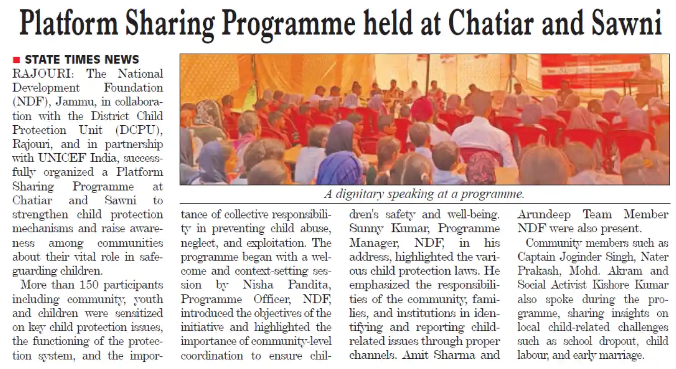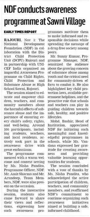 NDF conducts Awareness Programme on Child Rights, Child Protection & Substance Abuse at High School Sawni, Rajouri